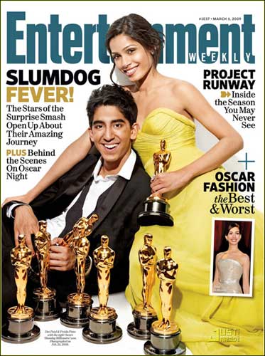奥斯卡结束了,但是奥斯卡带来风潮和效应并没有结束,而横扫奥斯卡的《贫民窟的百万富翁》也捧红了男女主角,他们等上了《Entertainment》杂志的封面,封面上两个人眉开眼笑,手拿小金人拍照。