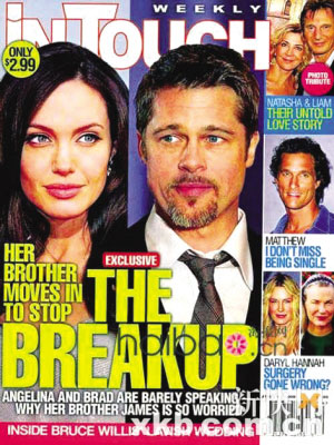 布拉德·皮特和安吉丽娜·朱莉的梦幻爱情,似乎有幻灭的趋势。最近,不止一家的美国杂志报道了两人的感情危机。就连台湾媒体也不甘示弱,报道中称布拉德·皮特、安吉丽娜·朱莉关系陷入冰点,两人协议暂时分居。假如情势无法挽回,小布将争取六名子女的监护权,另外,高达2亿美元的财产分配问题,恐怕也会让这对“史密斯夫妇”展开厮杀。