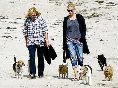 当地时间2009年5月2日,查理兹·塞隆和妈妈一起到海滩遛狗,五只品种各异的小狗可爱至极。但查理兹的家俨然已经成为一个小狗窝,狗比人还多。