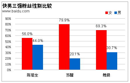 报告指出,整体来说快男的粉丝女性多过男性,但苏醒和魏晨都属于对女性有超高杀伤力的,而陈楚生相对来说拥有较多的男性粉丝。其中,苏醒的女粉丝比例高达79.9%,而陈楚生的男粉丝也高达44.0%。