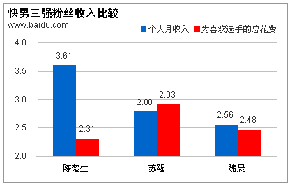 报告还对快男三强的粉丝群体特征进行了分析,并得出了一些有意思的结论。比如,陈楚生男粉丝最多、苏醒粉丝更愿意为其花钱、魏晨粉丝年龄最小等等。