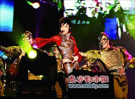 压轴的李宇春一出场就声势浩大。烟火四射,黄色气球簇拥着一起升天,李宇春在庞大的伴舞团开路下杀到,满场欢呼。大家一起和应《我的王国》、《HappyHour》、《冰菊物语》和《kulala》,显现李宇春依然是天娱一姐的地位。(记者 何颖珊)
