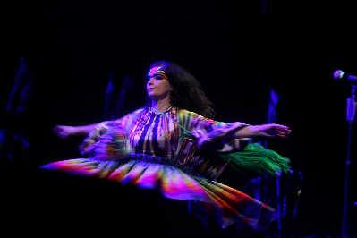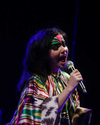 随着去年发行的新专辑中主打歌《Earth Intruders》的音乐响起,比约克赤脚登场,身上的服装并不是此前在香港曝光过的那套“七彩唐僧装”,而是一套新专辑封面照的真人版———红黄蓝绿的五彩大摆裙、紧身打底裤,那双光着的大脚在现场蓝色灯光的映衬下,呈现出一种略带鬼魅气息的荧光蓝。简单的舞台上空飘荡着的五彩布上画着各式动物图案———癞蛤蟆、蜥蜴以及咸鱼;舞台右侧是她此次巡演备受瞩目的女子铜管乐手们,人人头上都插着红色的旗帜。一曲唱罢,比约克兴奋而干脆地用不标准的中文大声说,“谢谢!”夹杂着观众中此起彼伏的口哨声、掌声和些许撕心裂肺的吼叫声,现场从一开始就预示着即将到来一场回归原始本能的热情。