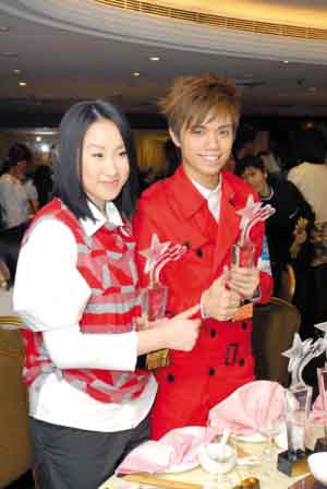 当天庆功宴上,张敬轩不避忌地与绯闻女友王菀之合影。