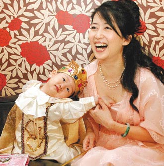 据台湾联合报报道,小宝弟穿上帅气的王子装,伸手要他最爱的公主妈妈抱抱,被医师评为“长得超快”的头围戴不住王冠,不怕闪光灯的他却不愿配合笑,但妈妈一句“装可爱”口令,他马上挤眉弄眼假笑,另一只手还老不自觉地往妈妈胸口抓,急得这孟庭苇猛护胸:“小宝弟,你对妈妈非礼喔。”