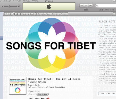 今天,在苹果公司数码媒体播放应用程序iTunes的网站上,一张名为《写给西藏的歌》(Songs for Tibet)的专辑出现在可购买下载的曲目名单上。据悉,这张专辑由歌手Sting(斯汀), John Mayer(约翰•梅耶尔)和Dave Matthews(达文•马修)等歌星参与制作。