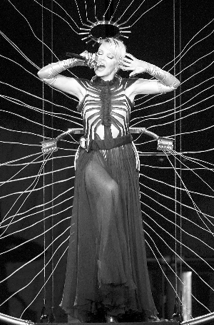 面对全场上万名观众同时注视的这面“镜子”,凯莉·米洛将伴随着一种特制的金屑和彩色漂浮物,由远及近由小变大,最终化身为一个“艳后”。