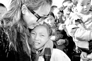 孙悦帮孩子们擦干眼泪,叮嘱他们好好学习,并且承诺,等音乐教室建成后,她会再来学校给孩子们上音乐课。文/记者寿鹏寰
