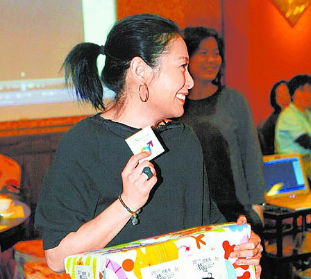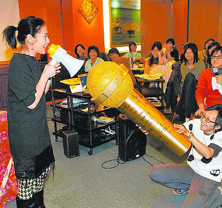 歌迷送刘若英(左)巨型麦克风,希望她继续唱歌。