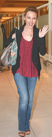 凯莉身穿黑色西装、紫红色上衣、牛仔裤,轻便俏丽,衬着歌迷“Can't Get You Out of My Head”的歌声,她在自己请的一名女性保镖、主办单位请的10名保全护卫下离开机场,面对大批摄影记者几乎贴近她脸的镜头,未显任何不悦。