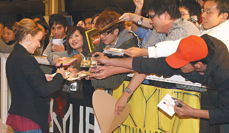 中新网12月3日电 澳洲女歌手凯莉·米洛昨天傍晚抵台,为明晚在中山足球场登场的演唱会准备,虽贵为天后,但凯莉态度亲和,带着招牌笑容为歌迷签名,表现出亚洲巡回终站的好心情。