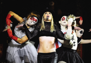 在结束了日前的欧洲宣传行之后,布兰妮于本周二回到“主场”纽约,亮相《早安美国》电视节目。为了给同日发行的新专辑造势,布兰妮在节目中演唱了新专辑的主打歌《花心男》和《马戏团》,除了“小丑”装扮的伴舞演员,现场还亮出大型火环,噱头十足。