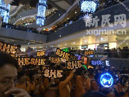 当日下午4时许,记者在签售现场看到,近千粉丝身穿橙色歌迷会会服,高举灯牌大喊S.H.E的名字,并称金融风暴挡不住S.H.E专辑的大卖。