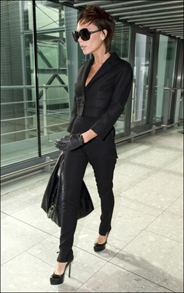 维多利亚·贝克汉姆前几日还是一袭白衣出现在公众的面前,昨天(2月11日)就换上了一身黑衣服出现了,这次还真是黑的彻底,黑头发,黑墨镜,黑衣服,黑裤子,黑手套,黑书包加黑面,一黑到底。手腕上的金手镯提升亮点,但是真是黑啊。