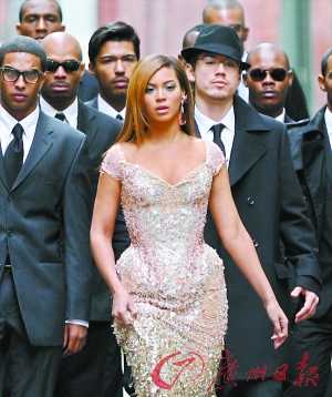 一袭Tierry Mugler钉珠镶亮片紧身长礼服,让碧昂丝著名的丰胸、蜂腰、丰臀身材一览无遗,她身后更有一群身穿黑色西装的猛男尾随,更凸显她的“女王”丰姿。