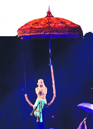 3月初,“小甜甜”布兰妮展开她的复出巡回演唱会, 多变的造型堪比麦当娜,内衣外穿,野蛮女警等造型都堪称火辣。为配合新专辑《马戏团》,布兰妮打扮成马戏团表演者,在舞台上奉献了很多杂技表演,她还蒙上眼睛与两名男舞者一起跳舞一起演唱《Touch of My Hand》。她在高空坐在“伞柄”上以印度舞娘造型出场,远看甚为惊艳,近看发现她腹部堆积着赘肉,跳肚皮舞倒是不错。看来布兰妮还需要减肥。