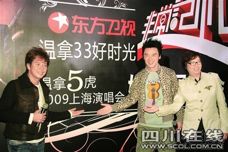 昨日,谭咏麟钟镇涛现身上海为“温拿五虎2009上海演唱会”宣传,谭校长无意中泄密——