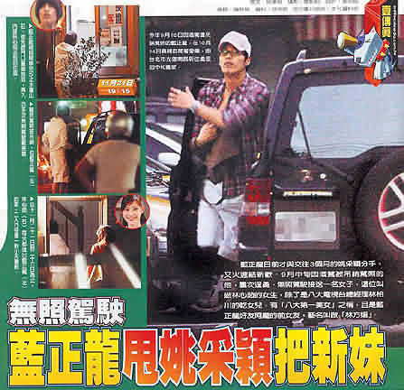 蓝正龙近来桃花盛开,与大s分手后,他行情看涨,先前才与名模姚采颖玩完三个月恋情,最近又搭上新欢林心茹,据报道,蓝正龙九月因酒驾被吊扣驾照,但他仍常开车接送林心茹,女方也常出入蓝正龙住处。