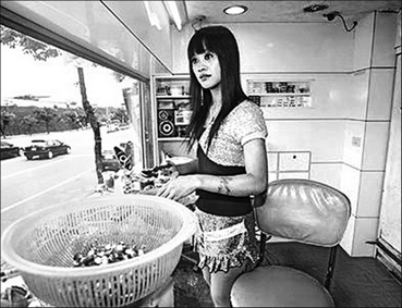 这个名叫小萍的西施,与蔡依林简直就像双胞胎姐妹,今年22岁的她,虽没有蔡依林的傲人身材,但比26岁的Jolin更显青春无敌,见人就笑,具亲和力。据台湾媒体报道,其他店员猛夸小萍公关技巧一流,很会卖槟榔。目前她是“海豚湾”的一大镇摊巨星。(小易)