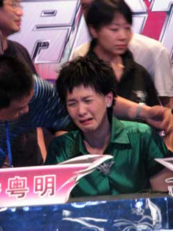 对话进行至此,杨二显然被激怒,她立即指责代闯不真诚,刚才把戒指送给了她,现在又出言侮辱,她说:“你把这个戒指拿回去!你拿回去!我不要!”杨二的怒火也瞬间点燃了柯以敏,因为自己心爱戒指的一送一还,仿佛自尊心受到了很大的伤害,开始哭泣起来。这下子,场面有些混乱了,杨二不顾镜头走过去劝慰柯以敏,但柯以敏悲愤难当,现场发誓要立即退出这个选秀活动。正在纠缠不清时,评委会主席刘晓庆以老大姐的身份出面熄火,事件才暂告段落,节目继续进行,当晚的直播进行到00:30才结束。