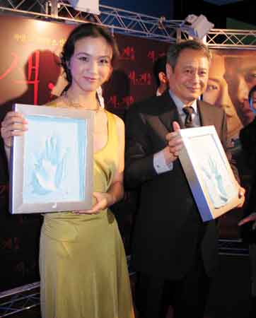 “中央社”报道说,李安和汤唯在影片“色•戒”的韩国发行商“C.J.娱乐公司”的安排下,今天下午六点半,冒着早冬的寒雨,走上龙山CGV戏院售票区的红地毯,向围守在现场的媒体记者、粉丝近四百人,和蔼可亲地握手答谢,并按捺了手掌印模,展现出极为热诚的态度。