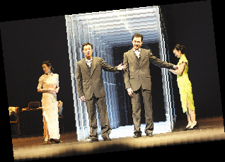 如果你中途进场,舞台上8个人走来走去可能会让你有点摸不着头脑。穿着一样的西装背心和西裤的两个振保,辛柏青代表世俗的、不得不扮给社会看的表象的振保,而高虎则代表内心的那个不时想出轨、不时与自己斗争的内心的振保。而红玫瑰和白玫瑰也都有两个,同样一个是内心想做的、一个是表象必须做的:你可以看到秦海璐饰演的红玫瑰在与振保调情,而舞台后方另一个与她同样打扮的红玫瑰还在与丈夫王士洪悠闲地听着唱片;你可以看到胡靖钒饰演的白玫瑰在嘱咐丈夫振保“出门记得带伞”,而在她身后另一个白玫瑰正在与小裁缝暧昧地聊天……一开始还真有点不适应,可看进去却觉得这种形式非常新奇有趣。经常是,2个振保、4朵玫瑰,加上王士洪和小裁缝8个人一起出现在舞台上,一起说话、一起行动,奇怪的是,作为观众的你并不觉得混乱。舞台形式也很有趣,舞台中央一道玻璃通道,2个振保一同从幕后走进通道,然后分别打开通道两侧的门,一个走进现实生活中与白玫瑰的家,另一个走进另一侧与红玫瑰的回忆。