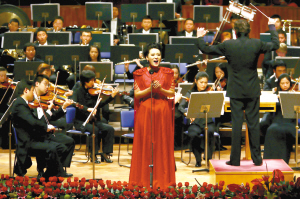 下半场,著名小提琴家文薇身着孔雀绿的露肩晚礼服与粉红色的高跟鞋炫丽登场,演出了炫技的名曲圣·桑的《引子与回旋随想曲》;稍后压轴的著名歌唱家谭晶身穿红色晚礼服亮相,一连唱了三首颇具民族特色的歌曲《在那东山顶上》、《大红公鸡毛腿腿》和《青藏高原》,将音乐会带入了高潮。