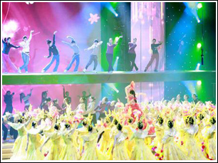 歌舞类节目时长为1小时,记者粗略计算,仅上半场的歌舞类节目就占了近50分钟。开场舞《飞向春天》由185位女舞者共同完成,她们不断变换队形,时而如花潮涌动,时而像火山喷发,热闹而奢华;舞蹈《飞天》题材独特,7位女孩宛若传说中的七仙女,舞步婀娜多姿。歌曲方面,费玉清有幸独唱《千里之外》,其他歌曲则多以串烧形式登台,庞龙的《啷咯情歌》、凤凰传奇的《月亮之上》、黄圣依的《天天向上》、胡杨林的《香水醉》、张澜澜的《一家人》、郭美美的《不怕不怕》分别占据流行板块和新人板块。