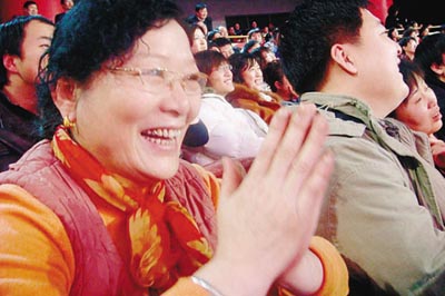 “‘装’你们知道不?‘装’在我们东北就是‘显摆’的意思。你说我老师(指魏积安扮演的田教授)他多能装呀!花5000块钱买双皮鞋,6000块钱买块手表,7000块钱镶口大金牙,然后一见我面就这样:你看现在都8点了,我一会请你吃饭,你要不去我踢你……”这一段新加的台词配合着小沈阳夸张的龇牙咧嘴的动作,把现场的观众都笑翻了。坐在记者身边一位40多岁的大姐一连笑一边捂肚子,记者问她是东北人吗?能听懂小沈阳的笑料吗?大姐还满脸的纳闷:“这还用分哪儿地方的人吗?谁听谁不乐呀!”从昨日的现场来看,为了突出小沈阳的个人魅力,有长达一分半钟的时间都是小沈阳一个人在舞台上脱口秀,而这段台词的“笑”果确实不同凡响,引起的笑声比其余7分钟都多。