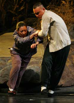 资料图:著名演员梁冠华以一位外号“狗儿爷”的形象演出话剧《狗儿爷涅槃》。 中新社发 满会乔# 摄