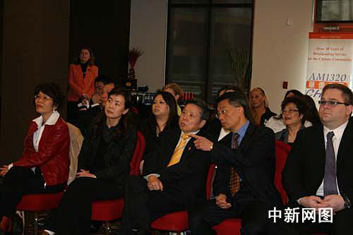 中国驻温哥华总领事杨强(右三)出席新丝路北美模特大赛(ITM)记者招待会。吕振亚 摄
