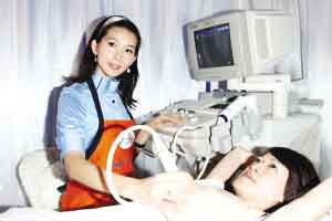 4月12日,“台湾第一名模”林志玲(左)在台北出席乳癌检测公益活动时,穿上自己设计的三点不漏围裙,在工作人员的“义乳”上示范女性如何进行乳房自我检查。 中新社发 董会峰 摄
