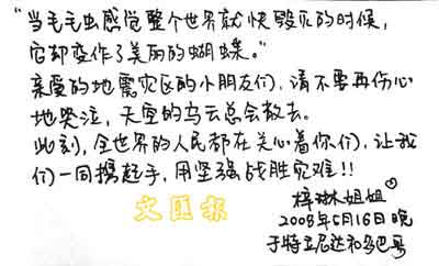 中新网5月21日电 四川发生巨变,现正以世界小姐身份到全球各地访问的张梓琳,发布一份由她亲笔写下的鼓励灾区小朋友的信件,并急切希望能早日回国参与及帮助灾区的活动。