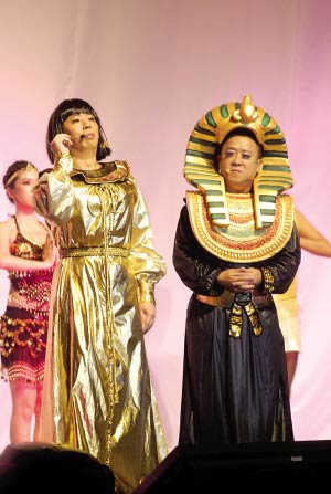最近的流行大片海报也惨被“恶搞”,包括《赤壁》、《色,戒》等都被改头换面,《赤壁》成了《破壁》,《见龙卸甲》变成《见红脚甲》。曾志伟与林敏聪还换了多个搞怪造型登台,其中以埃及法老、妖后的造型最为出位。本报记者 陈明辉 摄影 阿文