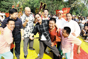 “迎奥运津门民间武术、摔跤表演赛”日前在长虹公园举行。 60名武术、摔跤、散打等民间高手纷纷亮绝活。曾6次荣获天津市中国式摔跤冠军的郑国瑞率众弟子一展身手。从小酷爱摔跤技艺的著名相声表演艺术家李伯祥,山东快书名家储丛善,喜剧演员吴迪、吴跃不仅前来捧场,而且专门创作表演了节目,李伯祥还与郑国瑞进行了跤技切磋。图为相声名家李伯祥与摔跤冠军郑国瑞进行跤技切磋。
