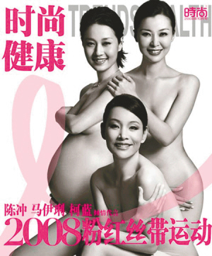 以关爱女性健康为宗旨的“粉红丝带行动”每年都会找一些女星来作宣传。今年他们找来了怀胎9月的马伊琍和陈冲、柯蓝则拍摄了一组全裸照片,展现女性的自信和美丽。这组照片于日前公开刊发在《时尚健康》杂志上。