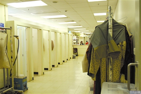 化妆室的尽头连接着服装间。走进服装间,记者发现里面还有一排更衣室。更衣室尽头有一个柜台,两旁放着挂满衣服的推车。平时衣服的推送靠的就是这些不起眼的推车。服装间外堆放着数个箱子,里面放着“时装戒指”、“钻石戒指”和“心口针”等人造首饰。据了解,TVB的演员,无论多大牌的明星,都是公用化妆间,只有两个人有自己的化妆间,一个是汪明荃,一个是已经永别的沈殿霞(肥肥)。
