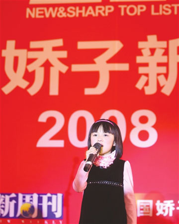 昨晚的颁奖典礼一开始,一阵天籁般的童声就从会场传来,一个留着娃娃头的可爱小姑娘唱着《歌唱祖国》登上了舞台。她就是奥运会开幕式那首《歌唱祖国》的演唱者杨沛宜。杨沛宜在这次中国娇子新锐榜中获得了“2008年最美的声音”,巴蜀鬼才魏明伦成为了她的颁奖嘉宾。