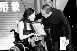 第二届演艺名人公众形象满意度调查发布盛典昨晚在京举行。曾因排演2008年北京奥运会开幕式受伤致残的刘岩,获得了中国年度舞蹈最佳表现女演员奖。