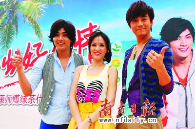因主演《恶作剧之吻》、《命中注定我爱你》、《恶魔在身边》等偶像剧而走红的台湾人气偶像郑元畅、陈乔恩、贺军翔日前现身广州出席某饮料代言活动。