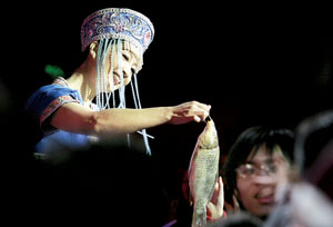 见柚子落到身边的人手中,一位观众叹着气刚要坐下,徐凤美身子一晃,又变出一条鲜鱼送给他。意外的收获令这位观众张大了嘴巴,全场响起掌声。