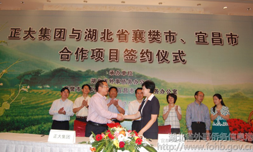 中新网7月8日电 据湖北外侨办消息,7月8日上午,正大集团与湖北省襄樊市襄阳区政府、宜昌市宜都市政府合作项目签约仪式在武昌举行。