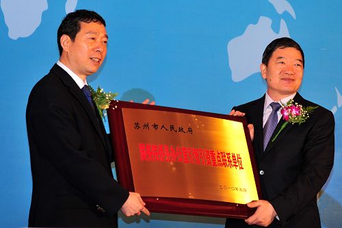 中新网苏州7月12日电(李克祥)11日举行的2010苏州国际精英创业周开幕式上,国侨办副主任任启亮向苏州市政府授牌“国务院侨务办公室引智引资重点联系单位”,这一荣誉授予一座城市尚属全国唯一。
