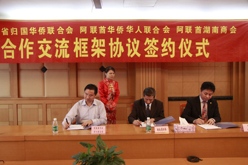 省侨联党组书记李宁,阿联酋华侨华人联合会常务委员刘云梅,阿联酋湖南商会会长常琪代表三方签订了《关于加强相互合作交流与支持的框架协议书》。三方达成以下共识:1、加强三方领导及工作人员间的交流与往来,加强沟通,促进互信,服务国家大局;2、加强三会和两地间的经贸、科技、投资等领域的合作与信息交流,促进共同发展;3、加强三会间的文化交流与合作,共同为传播中华文化而努力;4、加强三会间为侨界和会员的维权帮助和法律帮助,共同维护好侨界合法权益;5、加强三会在社会救助和公益慈善事业方面的合作与交流,加大相互支持力度。