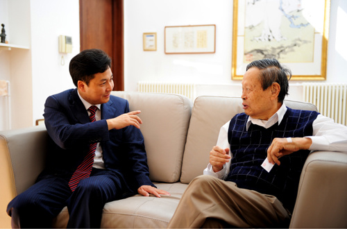 已是88岁高龄的杨振宁教授,见到友人朱奕龙一行来家拜访,很高兴,紧紧拉住朱奕龙的手,热情地招呼朱奕龙坐在他的身边,夫人翁帆沏上浓浓的茉莉花茶,大家畅叙友情。杨振宁教授还爽朗答应朱奕龙的邀请,明年春暖花开的季节,一定携夫人到宁夏来走一走看一看。(舒展)