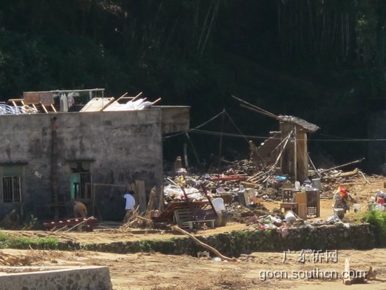 朱尔武一行又深入茂名市高州市受灾严重的曹江镇、大坡镇,实地了解当地灾情,看望慰问受灾归侨。沿途,路边的石头和淤泥铺了半层楼高,不时能见到倒塌的房屋,河堤上、河道里、滩涂上散落的竹、木、香蕉树、杂物到处可见,大部分桥梁已被冲断,一扁竹排成为一些地方连接两岸的唯一交通工具。救援队伍的推土机、钩机、自卸车不停地工作在清淤现场,满身泥浆的受灾民众正用各种方法奋力清除堆满屋内的淤泥。