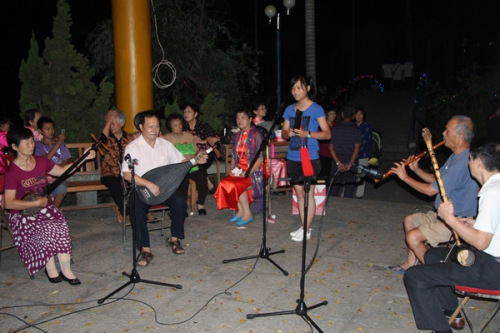 在金川前的小广场上,文艺晚会依旧丰富多彩,激情动感的舞蹈、诙谐幽默的小品、悠扬美妙的器乐弹唱赢来了一波又一波的掌声和笑声。而在秋中湖旁的小凉亭里,有支特别的乐队也吸引了不少老师学生驻足聆听,他们是由华侨大学退休教职工组成的南音演奏社。老人家们弹着琵琶,吹着筒萧,拉着二弦三弦,吟唱一首又一首韵味悠长的南音乐曲。来自桥南小学的几名学生也来助阵,老少合作的表演别样温馨。今年已经七十一岁的张彬彬女士表示,他们同是喜爱南音的老职工,她退休以来已经学了七八年的南音了,能把南音这一传统文化传播给更多人,他们都很开心。