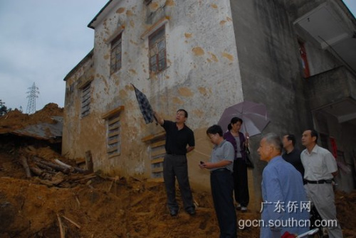 10月7日上午,董华民一行刚到茂名就驱车二百多公里深入信宜市重灾区钱排镇察看灾情,与镇、村干部商讨助建“侨心居”计划,并冒雨慰问了该镇钱新村、双合村、达洞村4户侨眷。随后,董华民一行又驱车穿越几十公里山路来到高州市重灾区马贵镇。这里的村庄灾情十分严重,山体滑坡和泥石流直接将村民的房屋、财物冲毁,需要异地重建。董华民详细察看了马贵镇三家村重建规划,表示可以率先援助该村建设“侨心居”和“侨心村”,帮助该村受灾村民在明年春节前住进新居。