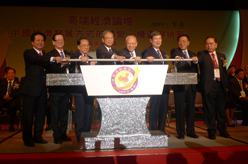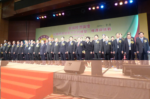 中新网11月17日电 据中国侨联消息,11月17日,由中国侨联、香港侨界社团联会、香港中国商会、中国侨商联合会共同主办的2010高端经济论坛暨第三届侨商论坛在香港会展中心举办。中国国务院原副总理、中国国际经济交流中心理事长曾培炎,全国政协副主席、中国工商联主席黄孟复,全国政协副主席董建华,香港特别行政区政府行政长官曾荫权,中央政府驻香港联络办公室主任彭清华出席了开幕式。大会由香港侨界社团联会副会长陈智思主持,本次论坛的大会主席、中国侨联主席林军致开幕词,香港特别行政区政府行政长官曾荫权致欢迎词。
