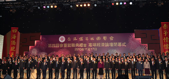 中新网11月19日电 据广东侨网消息,11月17日晚,香港侨界社团联会第四届会董就职典礼和“香港高端经济论坛暨第三届中国侨商论坛”闭幕晚宴在香港会展中心举行。国务院原副总理、中国国际经济交流中心理事长曾培炎,政协副主席、中国工商联主席黄孟复,香港特别行政区行政长官曾荫权,中央政府驻港联络办主任彭清华,中央统战部常务副部长朱维群,国务院侨办主任李海峰,中国侨联主席林军,外交部驻港特派员公署特派员吕新华,广东省副省长刘昆,中国侨商联合会会长陈有庆,香港侨界社团联会会长余国春等出席晚宴。
